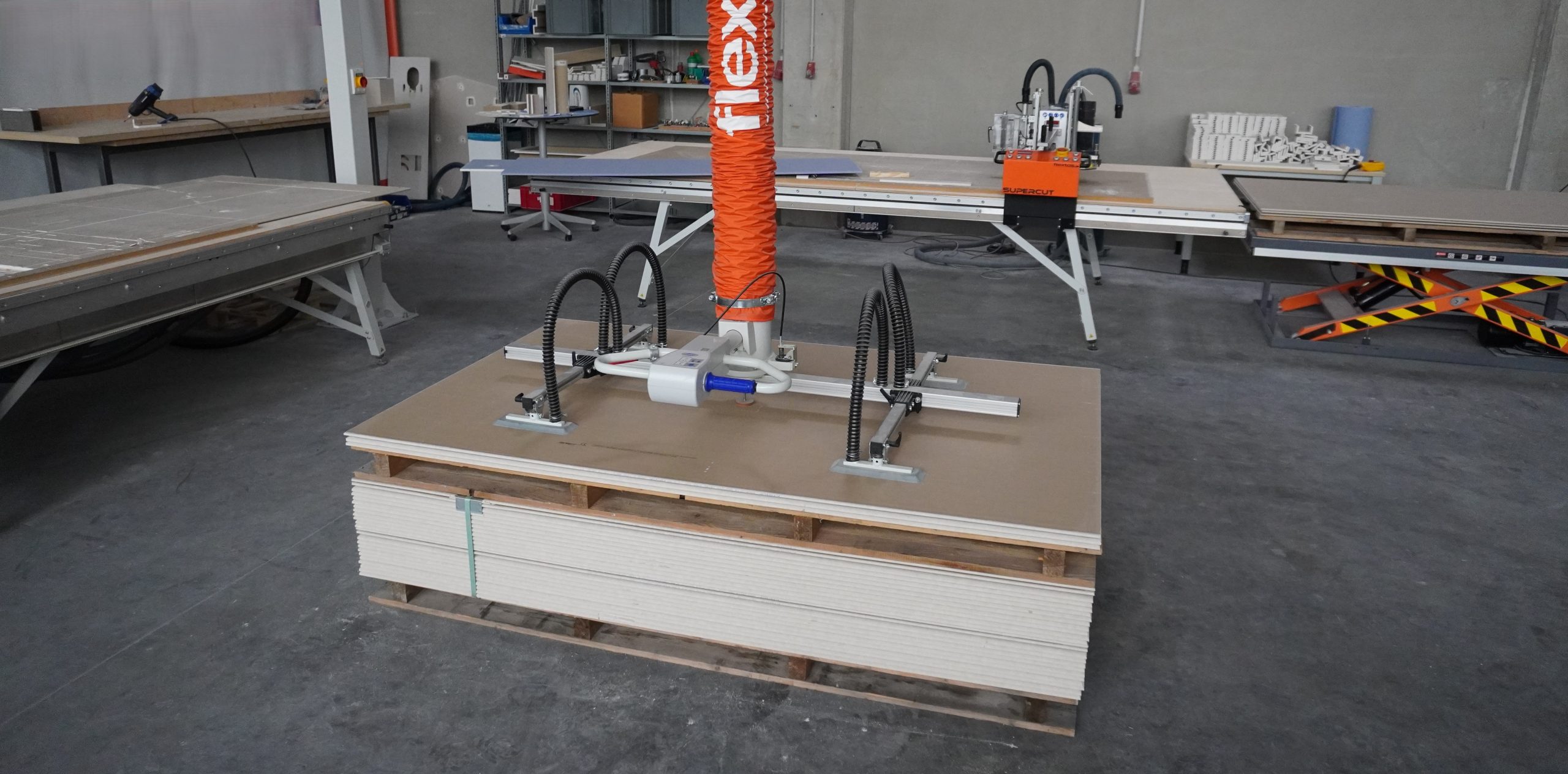 Der SUPERCUT VAL ist ein Schwenkkran mit 4-fach Vakuum-Sauggreifer. Damit heben Sie Gipskartonplatten ohne jede Kraftanstrengung dorthin, wo Sie sie benötigen.